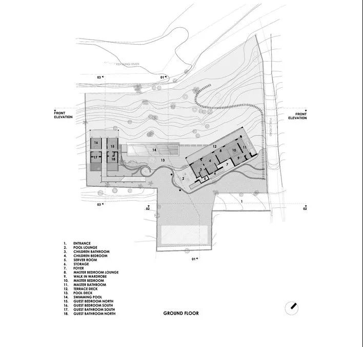 設(shè)計(jì)這棟別墅最大的難點(diǎn),是如何將其與周?chē)艿纳趾秃恿鞯牡匦蜗嗷ソY(jié)合,而別墅坐落在陡峭的山形輪廓上,最高最低處差異近 11