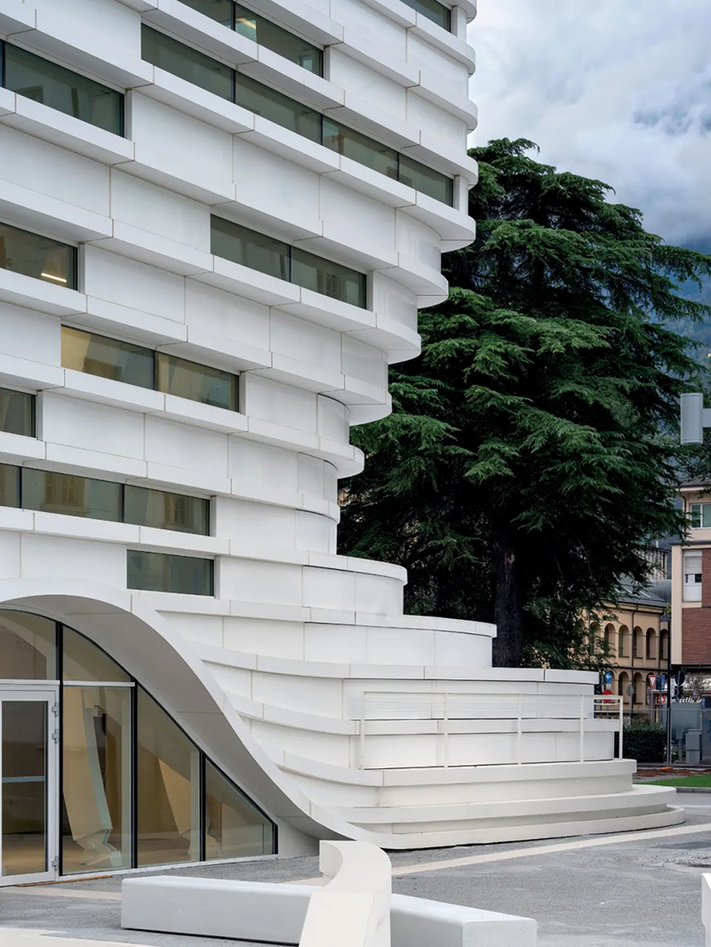 設(shè)計(jì)展示了如何構(gòu)建與景觀和氣候協(xié)作的當(dāng)代建筑。冰川的創(chuàng)意概念,呼應(yīng)阿爾卑斯雪山的自然景觀,擺脫了原有軍營建筑的僵硬感。既展示了對(duì)歷史建筑的尊重,又有助于城市記憶的延續(xù)。