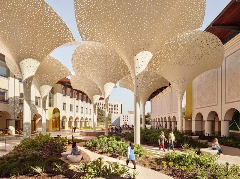 這些花瓣由穿孔面板制成,每片直徑30英尺,高度達(dá)40英尺。花瓣雕塑頂篷成為奧斯汀的全新門面,在重新定義布蘭頓藝術(shù)博物館的定位的同時,也歌頌奧斯汀的藝術(shù)和文化。