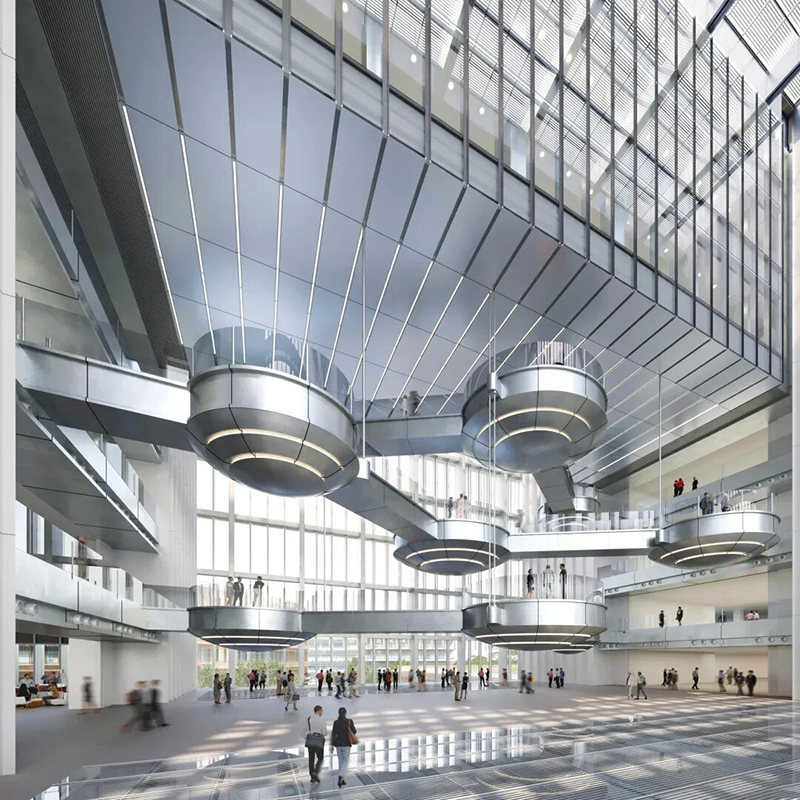 L形建筑懸臂于景觀(guān)建筑之上,是園區(qū)的研發(fā)中心。用戶(hù)通過(guò)三層高的大廳進(jìn)入,連接到反射池上方的中央中庭。多層橋梁跨越中庭,連接兩側(cè)的辦公和會(huì)議室,配有走道和大盤(pán)狀平臺(tái),為即興交流和會(huì)議提供空間。