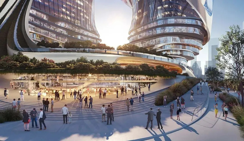 扎哈事務所的設計旨在創(chuàng)造一個新的地標,一組新的可識別的塔,讓建筑本身成為一個公共事件。方案完美地回應了深超總城市規(guī)劃設計的“十字生境”理念,并與周邊的公園和廣場建立了直接的聯(lián)通關系——裙房梯田狀的空間形態(tài)將中央綠軸自然地引入裙房公共空間,提供直接的連續(xù)感,并通過塔樓設計使該空間不斷上升,使建筑整體與綠軸景觀無縫連接。