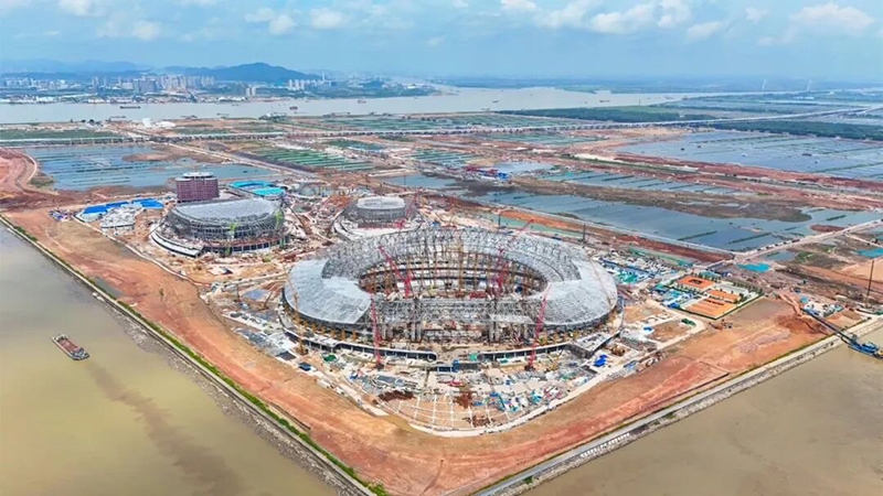 繼3月廣州南沙全民文化體育綜合體的 綜合體育場(chǎng)主體結(jié)構(gòu) 封頂之后,近日,該項(xiàng)目的綜合體育館、 游泳跳水館鋼結(jié)構(gòu)封頂并全面卸載完成, “明珠耀九州”姿態(tài)躍然呈現(xiàn)。至此,項(xiàng)目全面轉(zhuǎn)入 金屬屋面施工階段, 攻堅(jiān)場(chǎng)館閉水。